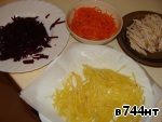 Половинку грудки нарезала тонкой соломкой. Свеклу натерла на шинковке для корейской моркови.