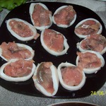 Теперь берем ломтик рыбки, вкладываем в внутрь кольца кальмара и выкладываем в судочек.