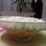 Крабовое мясо (я в этот раз использовала палочки, так как делала в качестве повседневного блюда) порезать на кубики. Добавить 1 ч.л. горчицы (соуса). Я предпочитаю использовать деликатную или французскую. Хорошо перемешать и выложить первым слоем в салатницу.