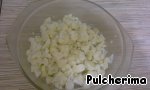 Сыр сулугуни порезать кубиками. Все выложить в чашку с отвареной капустой.