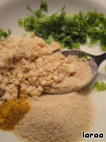 А вот подаваемые гребешки лучше в теплом виде. Для этого приготовить панировку из петрушки, сухарей , орехов и карри.