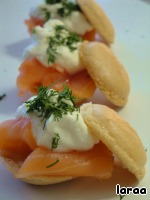 Из оставшегося белка я испекла Французский Макарон. Их я превратила вот в такие маленькие закусочки с семгой и взбитыми сливками.