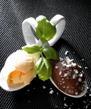 • Марк Фош предлагает этот крем подавать с абрикосовым мороженым и желатиновыми кубиками из базилика, посыпав крем солью Флор-де-Саль. Я подавала только с мороженым, так как вкус базилика был достаточным в креме. Но для больших почитателей базилика – рецепт найдете здесь https://www.povarenok.ru/recipes/show/45671/ .