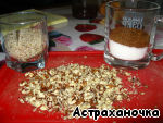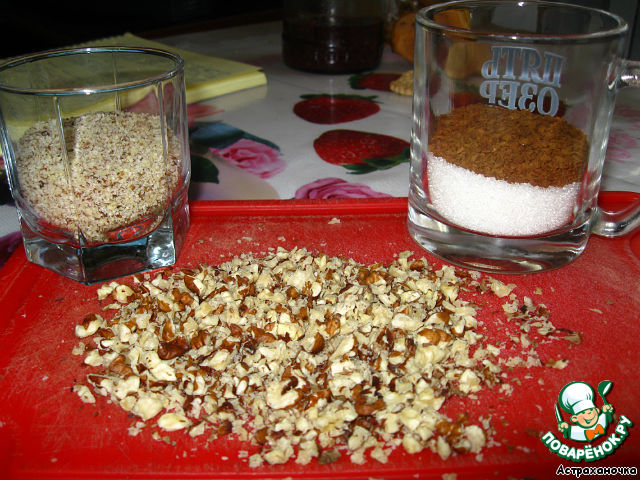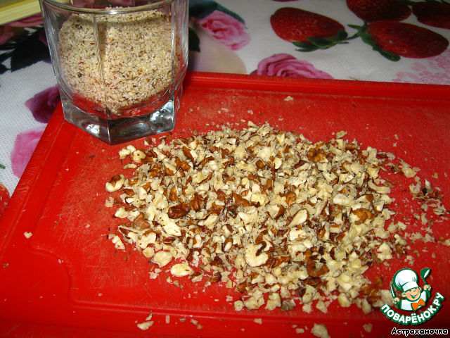 1/4 стакана орехов измельчаем в блендере с 1 ч. л. сахара в муку, и 1/4 стакана рубим крупненько ножом