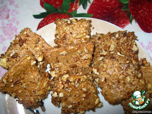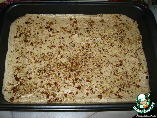 Взбиваем 4 белка, только что вынутые из холодильника, в крепкую пену и, не прекращая взбивать, постепенно добавляем кофе с сахаром. Затем аккуратно добавить орехи с сахаром, осторожно перемешать, вылить массу в противень, застеленный пекарской бумагой. Посыпаем рублеными орехами