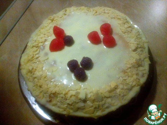Только я продуктов взяла в 2 раза меньше, на один коржик, и чуть побольше сахара( ибо сладкоежки)...ммм....доедаем уже))))