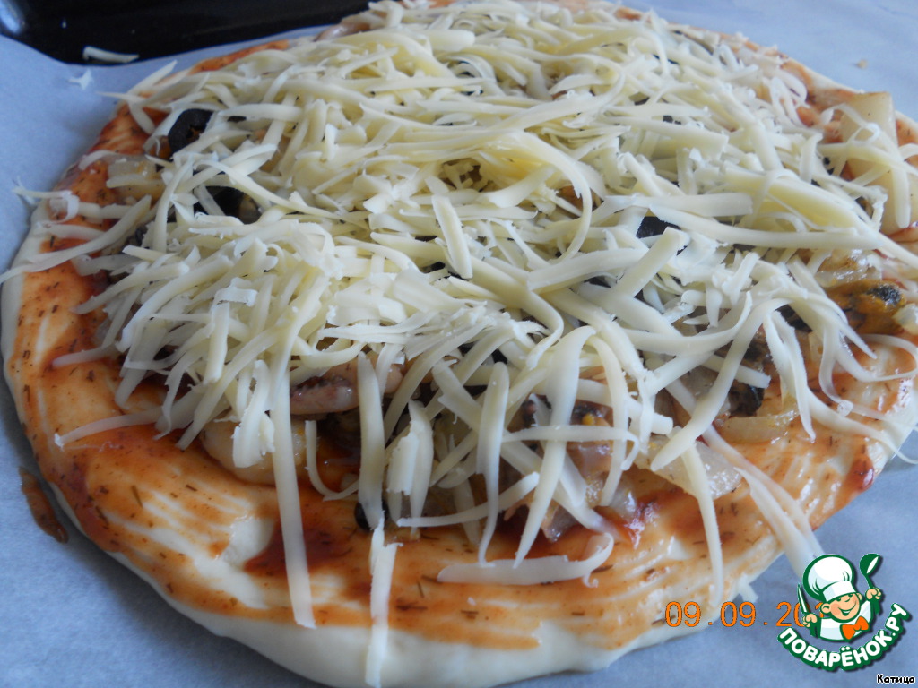 Основу смазываем кетчупом ,выкладываем обжаренный морской коктейль,режем оливки, посыпаем тертым сыром и в духовку на 30 минут при 200 гр -