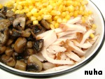 Добавить к картошке, яйцам, луку нарезанную курицу, остывшие шампиньоны и кукурузу (оставив немного для украшения).