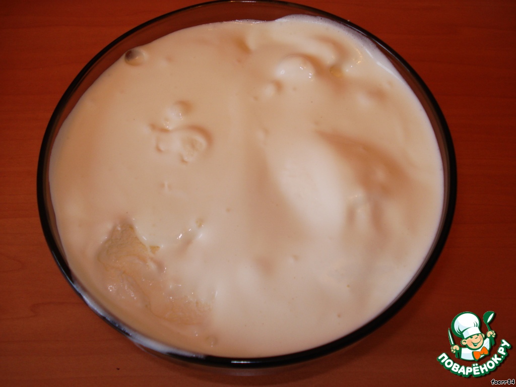 • Тем временем достаем пломбир из холодильника и оставляем, пока он полностью не растает (для пропитки), а сметану взбиваем с сахаром и сливочным маслом.