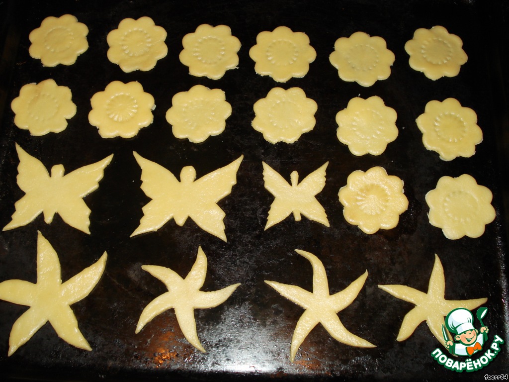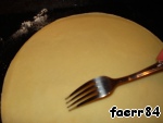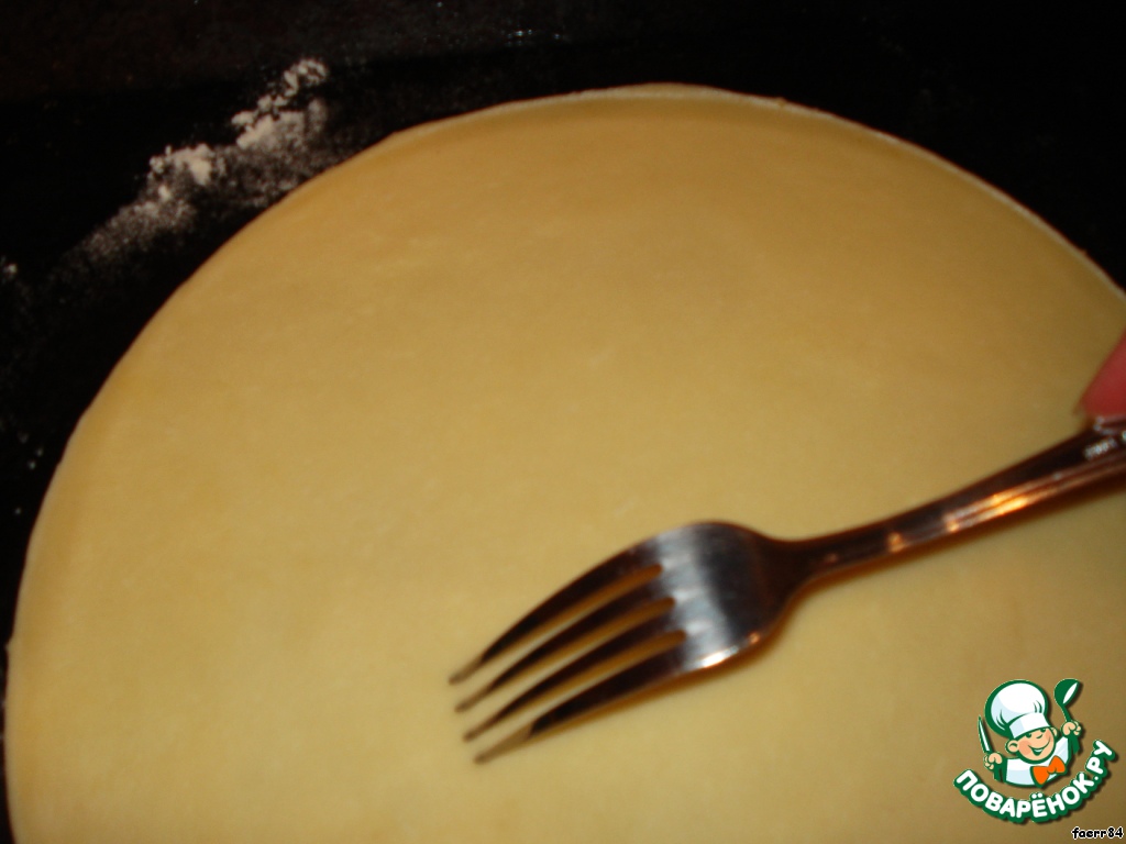 • Раскатываем корж, вырезаем круг, делаем вилкой дырочки и отправляем в духовку, пока не зарумянится.