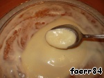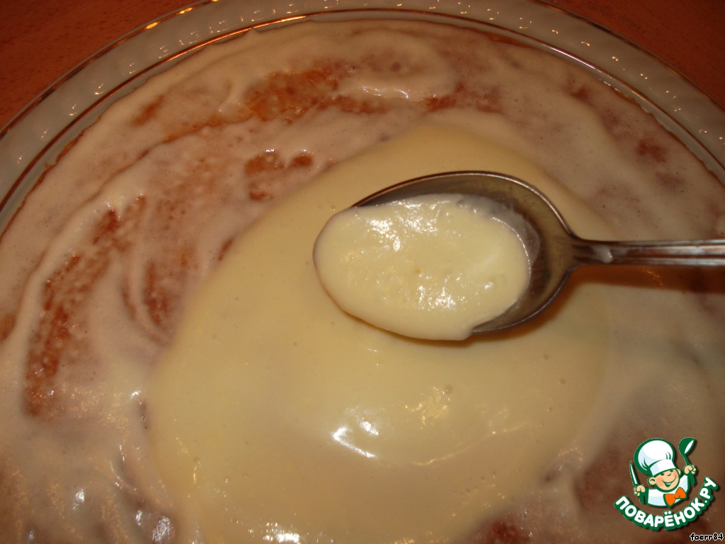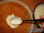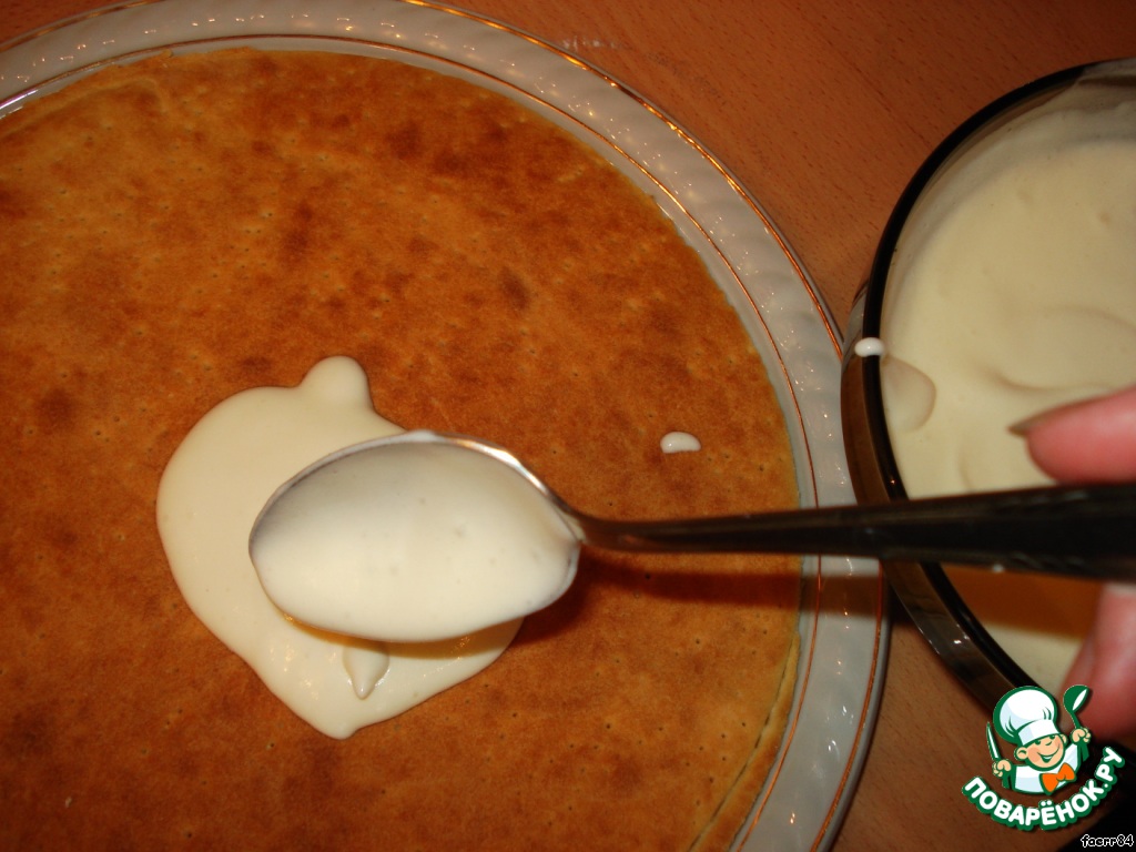 • Теплый корж промазываем растаявшим мороженым и оставляем минут на 5, что бы пропитался.