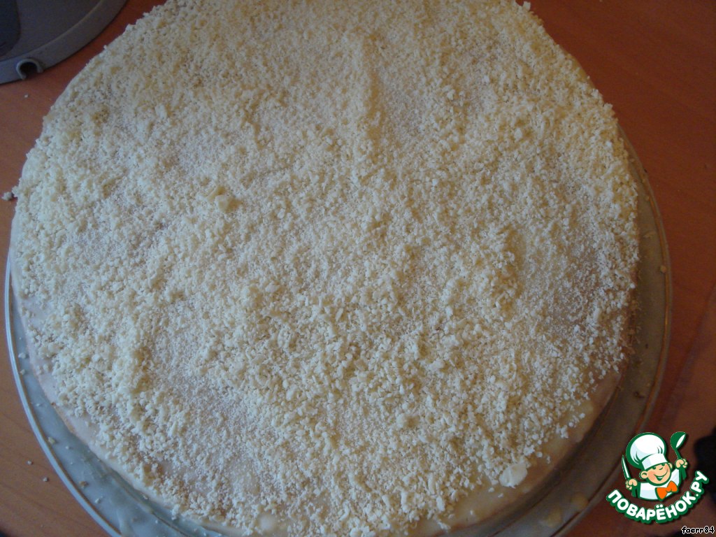 • Верхнюю часть торта посыпаем тертым белым шоколадом.