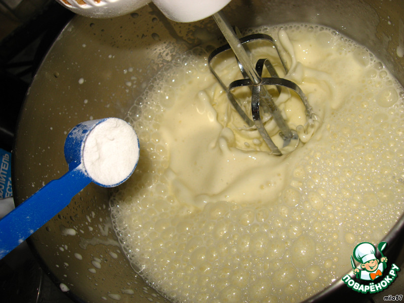 • Добавляем негашеную соду. И постепенно, ложкой добавляем муку, чтобы тесто стало густым как сметана, чтобы тесто медленно скатывалось, а не лилось)))