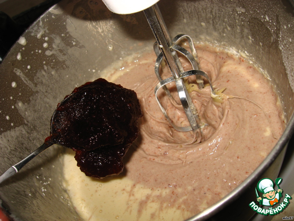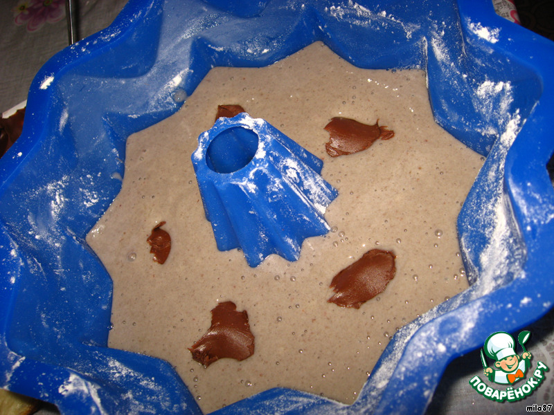 • ... затем ложкой выкладываем шоколадную пасту и заливаем все белой частью теста.