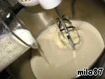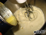 Взбиваем яйца с сахаром и щепоткой ванилина до белой пены, затем вливаем кефир. Перемешиваем на низкой скорости.