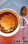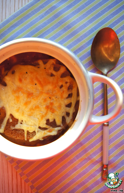 наливаем суп в порционную тарелку (горшочек и т. п.), отрезаем кусочек хлеба так, чтобы он был примерно по размеру вашей тарелки (горшочка и т. п.) и кладем сверху. Засыпаем натертым твердым сыром. -