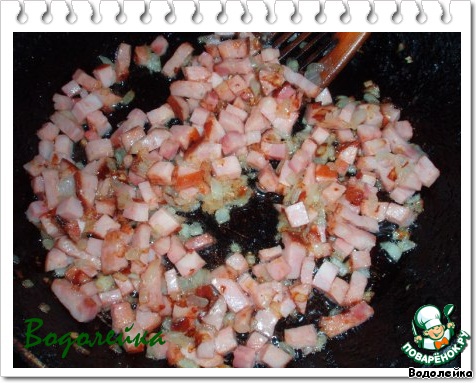 Итак, бекон (или другое мясо, колбасу) и лук нарезать кубиками (не очень крупно) и поджарить немного, скажем так, до золотисто-румяного состояния. -