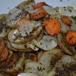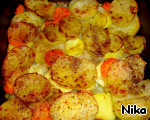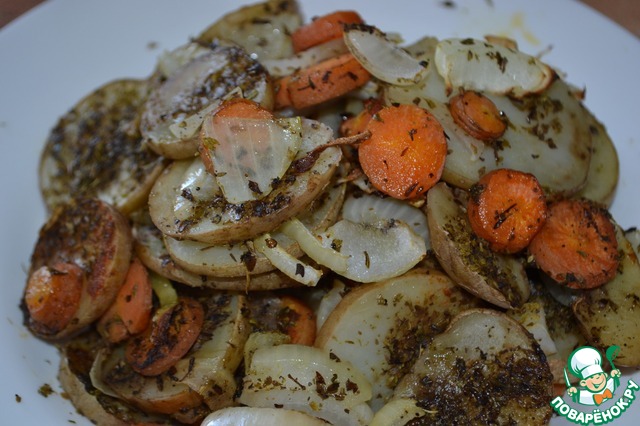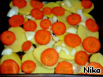 У меня получилось 7 слоёв - картофель, лук, морковь, картофель, лук, морковь и картофель. Посыпала приправой (для курицы) и перцем (не солила). Закрыла верх формы фольгой (блестящей стороной внутрь). Поставила её в горячую духовку на тридцать минут с температурой 180. Через 30 минут сняла фольгу, посыпала сверху солью и полила маслом. Форму поставила в духовку на 10 минут и включила спираль для гриля.