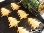 Через трафарет или просто уверенной рукой вырежем силуэты елочек. Рекомендую все-таки через трафарет, подойдет любой, даже сделанный из тетрадного листочка. С помощью ножа для теста елочки вырезаются очень легко.