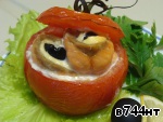 Помидоры аккуратно надрезаем не до конца - оставляем "шапочки". Вынимаем мякоть, солим внутри, кладем каплю майонеза. Ломтики рыбки раскладываем, солим, смазываем майонезом, укладываем кусочек сыра, половинку маслинки,
