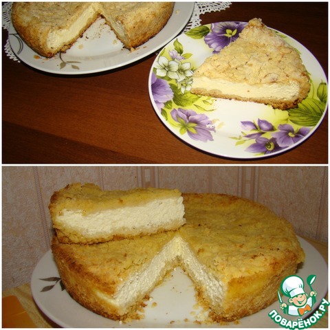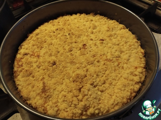 В смазанную маслом форму выкладываем половину крошек теста. Разравниваем. Выливаем начинку. Все это закрываем оставшимися крошками. Ставим в разогретую до 200 градусов духовку. И держим до подрумянивания. У меня стоял минут 40-45.