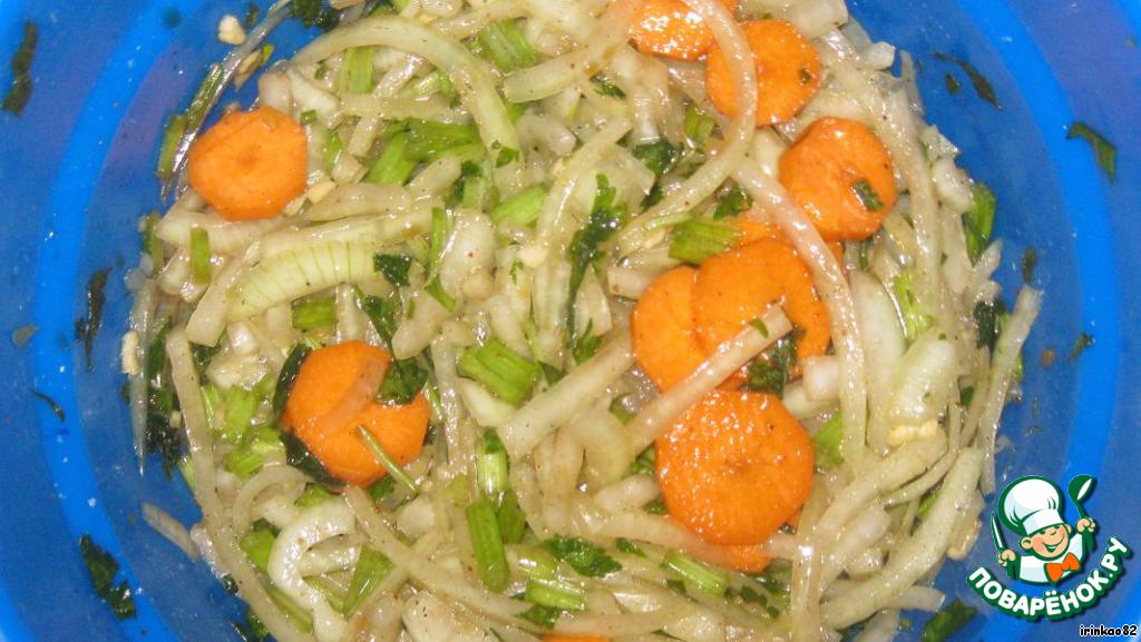 5 минуууут, 5 минуууут. 5 минут тратим на приготовление маринада. Лук, морковь, сельдерей и чеснок почистить, вымыть, крупненько нарезать и соединить.