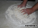 Затем насыпаем муку на стол, вываливаем в нее наше тесто - и месим, пока тесто не станет эластичным.