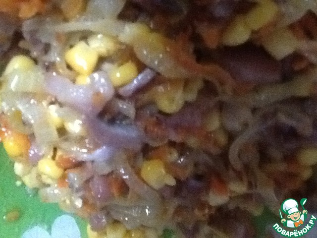 Из маленькой баночки кукурузы сливаем жидкость и добавляем к рыбе, затем остужаем лук с морковкой, добавляем в салат и хорошо перемешиваем.
