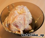 Маринуем курицу: смешиваем майонез с чесноком, продавленным через чесночницу, и соль (на среднего цыплёнка около столовой ложки); смазываем цыплёнка; оставляем мариноваться в холодильнике на 1 час.