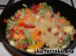 Пока маринуется цыплёнок, подготовим начинку: на сковороду выложить рис, добавить столовую ложку растительного масла, добавить овощную смесь и жарить, постоянно помешивая, 2-3 минуты на среднем огне, посолить, поперчить; залить 300 мл горячей воды, закрыть крышкой и оставить на маленьком огне на 15-20 мин.