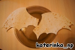 Пока цыпленок запекается, сделаем крылья и голову дракона: сложив два листа лаваша вместе, вырежем из них крылья дракона, а для того, чтобы они стали твердыми и держали форму, подсушим их в духовке или на сковороде на маленьком огне. Украсим крылья кетчупом, прорисовав жилки. Голову дракона сделаем из сваренного вкрутую куриного яйца: аккуратно вырежем места для глаз и получившиеся рожки вставим в заранее вырезанные треугольники на затылке; для глаз можно использовать ягодки или просто нарисовать их кетчупом; вырезать рот и нарисовать язычок.