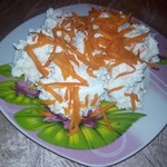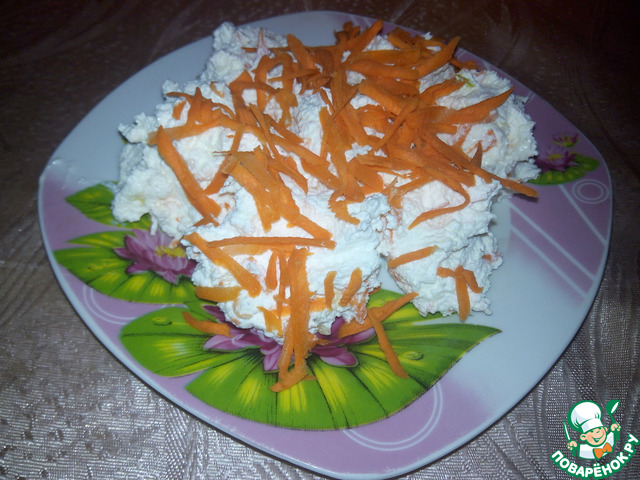 Взбиваем все блендером. Выкладываем на тарелку слой массы. Сверху присыпаем натертой морковью и мажем майонезом.