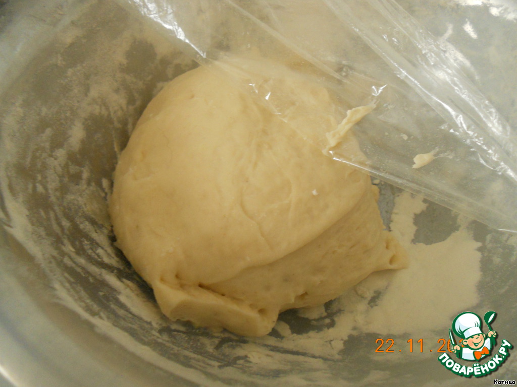 Тесто должно быть мягким, немного липнуть к рукам, но не крутым. Кладу тесто в ту же миску, накрываю пленкой и оставляю на 1 час подниматься!