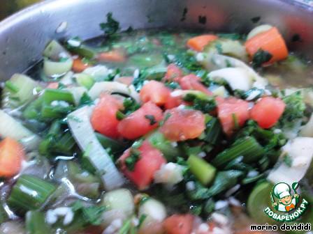Добавляем мелко нарезанный помидор и петрушку, сахар, соль, перец и перемешиваем. Доводим до кипения и закрываем крышку. Готовим 25-20 мин.