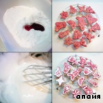 Розовый цвет делается очень легко. Я смешала сахарную пудру со свекольным соком и при помощи кисточки нанесла глазурь на пряники со всех сторон. Затем взбила белок с сахарной пудрой в пышную пену и при помощи кондитерского шприца нанесла узоры на пряники.