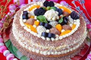 Достаем и собираем всю конструкцию. Верхний корж выкладываем на нижний. Бисквитные шарики и фигурный шоколад вкладываем в верхний корж. С помощью кондитерского шприца украшаем торт и заполняем пустые места между шариками и шоколадом. Уф, кажется Ф-Ф-Ф-СЕ! Отправляем тортик в холодильник еще на парочку часов.