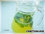 Процеживаем сироп в графин, добавляем 2 чашки воды, мяту и свежевыжатый сок. Перемешиваем и ставим охладиться в холодильник.