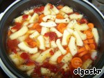 Режем мясо небольшими кусками, кладем на дно кастрюльки (муж делал в мультиварке). Потом слоями выкладываем крупно порезанные овощи - картофель, морковка, лук, кабачок, помидоры, можно еще баклажанчик (у нас его не было). Соль, специи по вкусу.