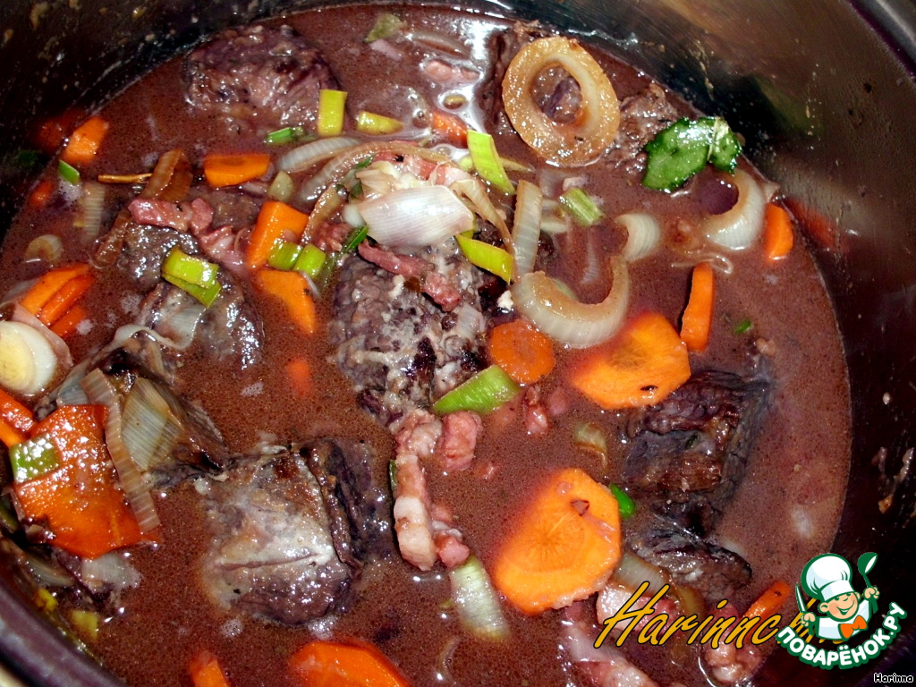 Говядина по-бургундски – кусочки мяса, тушеные во вкуснейшей винной подливке – простое французское блюдо из доступных продуктов. Поэтому, как и французские крестьяне несколько веков назад, вы можете взять любое мясо, которые подходит для тушения – например, лопатку или голяшку. Что же касается вина, лучше всего использовать бургундское, но если такой возможности нет, берите любое. Главное, не забудьте старое, доброе правило: не используй в готовке такое вино, которое не стал бы пить. А запах будет по-настоящему "сногсшибающий", поверьте! И мясо получается невероятно нежное, сочное, можно кушать одними губами! Рецепт взят с одного из французских кулинарных сайтов.