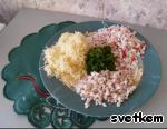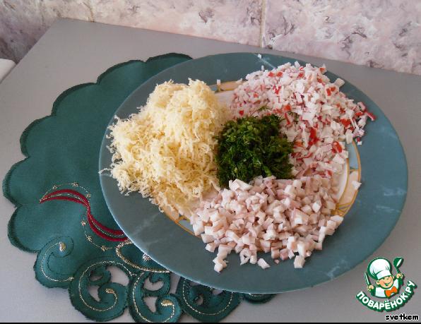 Отварной кальмар, крабовые палочки и зелень мелко режем. Сыр натираем на мелкой терке. Смешиваем вместе все ингредиенты, немного солим и добавляем майонез. Отправляем нашу заготовку в холодильник.