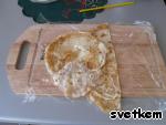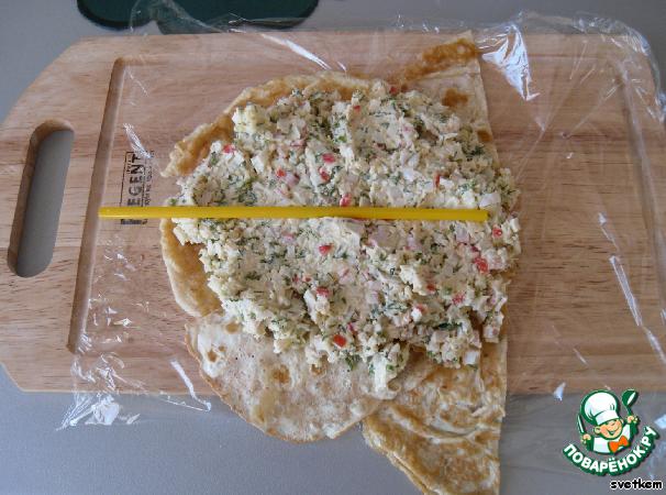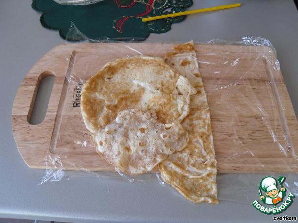 Яйца взбиваем с щепоткой соли и выпекаем блинчики. Из такого количества яиц у меня получилось 4 блинчика (у меня сковорода диаметром 16 см). Даем блинчикам остыть. Блинчики выложить на пищевую пленку.