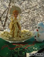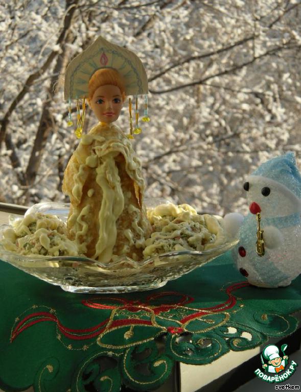 Устанавливаем нашу заготовку на блюдо и расписываем при помощи майонеза платье снегурки (я это делала при помощи шприца). Из остатков салата делаем снежный покров. Вот и готово!