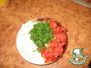 Брынзу и помидор нарезаем мелкими кубиками, как можно мельче режем зелень и давим чеснок. Добавляем это все к фаршу и аккуратненько размешиваем.