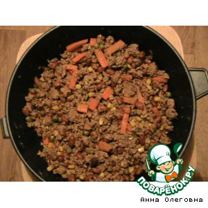 Горох, фасоль, кукуруза, жареный фарш, кетчуп чили и перец...