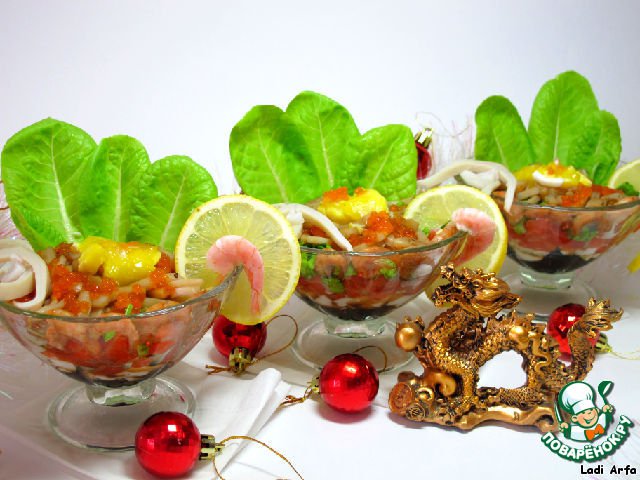 Чтобы задобрить Дракона, на новогоднем столе обязательно должно быть блюдо из рыбы и морепродуктов, так сказать, любимые лакомства Дракона. Предлагаю приготовить салат - коктейль, который обязательно ему понравится. Где же Огненный Дракон? Может, выйдем на балкон? Скоро будет целый год С нами жить он без забот.