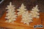 Выберем самые большие кружочки картофеля, поместим на один из них нарисованную нами звездочку. Аккуратно, иголкой протыкаем насквозь в вершинах самой большой, помещающейся на картофеле, звездочки, так сказать, переводим звездочку на один ломтик и вырезаем ее. Таким же образом вырезаем и меньшие звездочки...