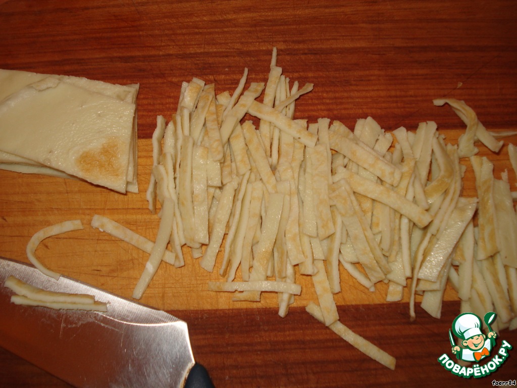 Отварное куриное филе нарезаем соломкой (по волокнам) и смешиваем с блинчиками |