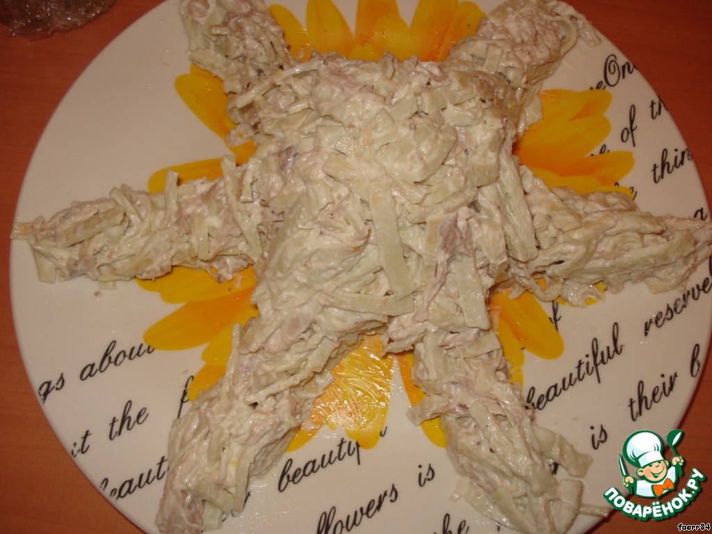 Описание: Этот салатик я попробовала у подруги и он стал одним из моих любимых. Теперь он всегда занимает почетное место на праздничном столе, а гости постоянно путают его с салатом из кальмаров.