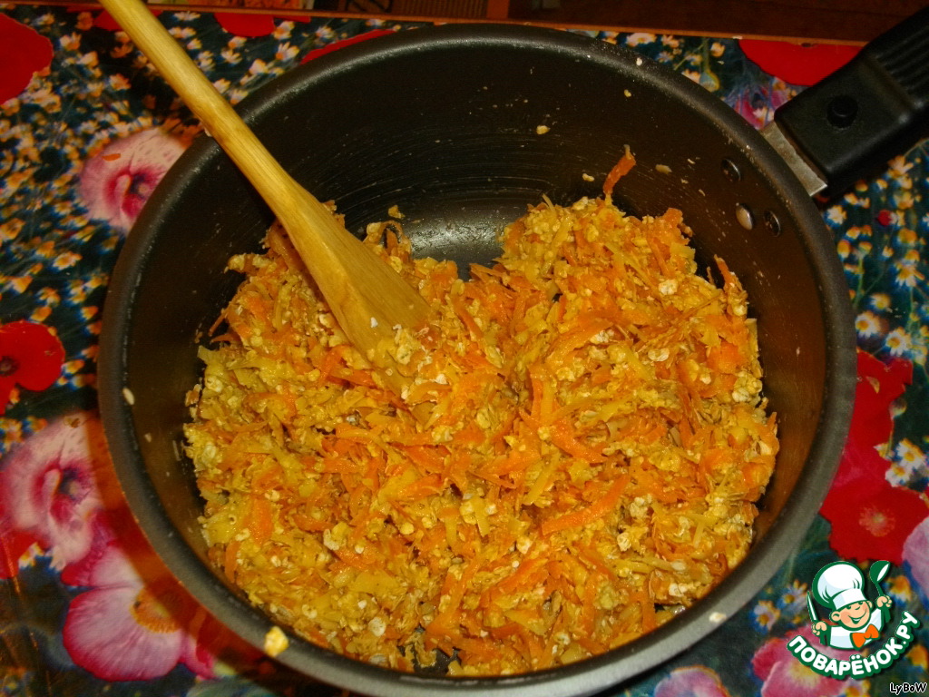 • Вот теперь в кастрюльку с маргарином добавляем тертый сыр, морковь, орехи, геркулесовые хлопья, смесь ароматных трав и яйцо.