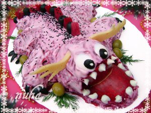Немного свеклы натереть на мелкой тёрке (но чтобы ещё остался кусочек), отжать сок и смешать с оставшимся майонезом. Смазать тело "дракона" поверх слоя из свеклы. Украсить следующим образом: глаза из белка яйца, маслин и майонеза, спина из кусочков свеклы, маслин и посыпана чёрным кунжутом, брови из сыра, когти из маслин, зубы из майонеза. Украсить само блюдо укропом, маслинами и оливками. Подать салат к новогоднему столу!
